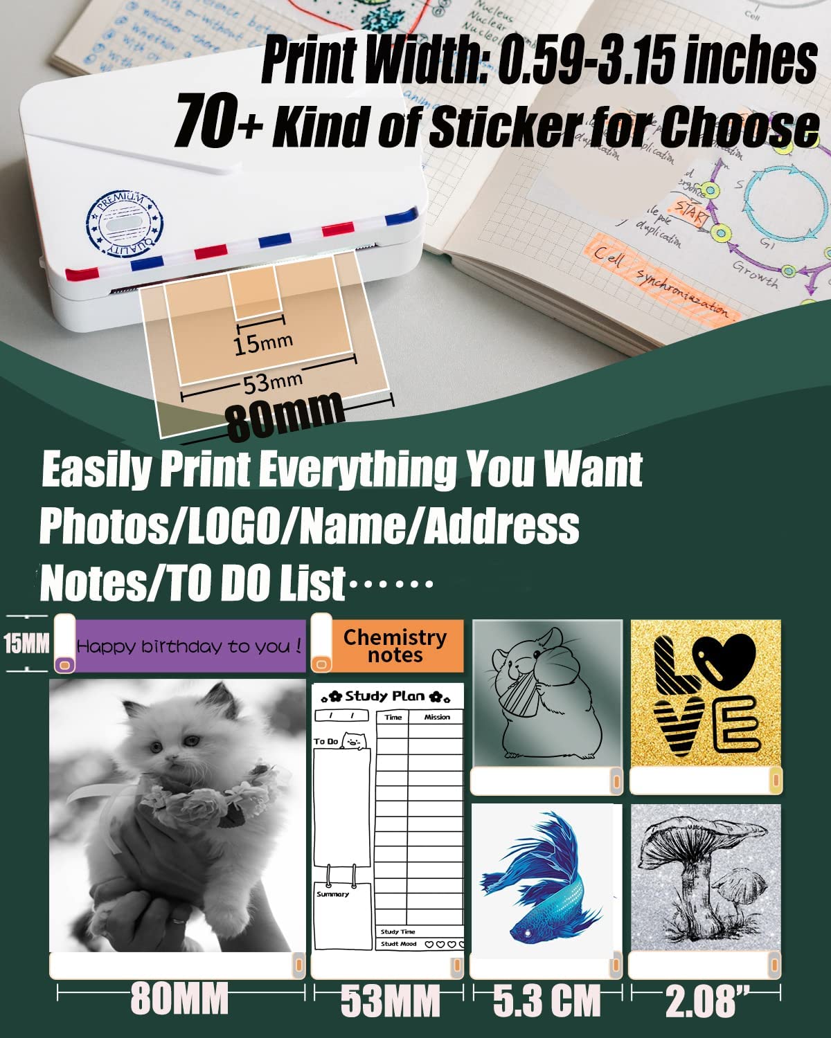- Multifunctional Sticker Printer: Compared with 2″ printer, M03AS has wider printing width: 0.59-3.15 inches, which is more widely used. Picture printer supports printing photos/1D/QR/diary/scrapbook/storage tags/webpage/memo …App materials are updated weekly, making it easy to create the most unique labels.