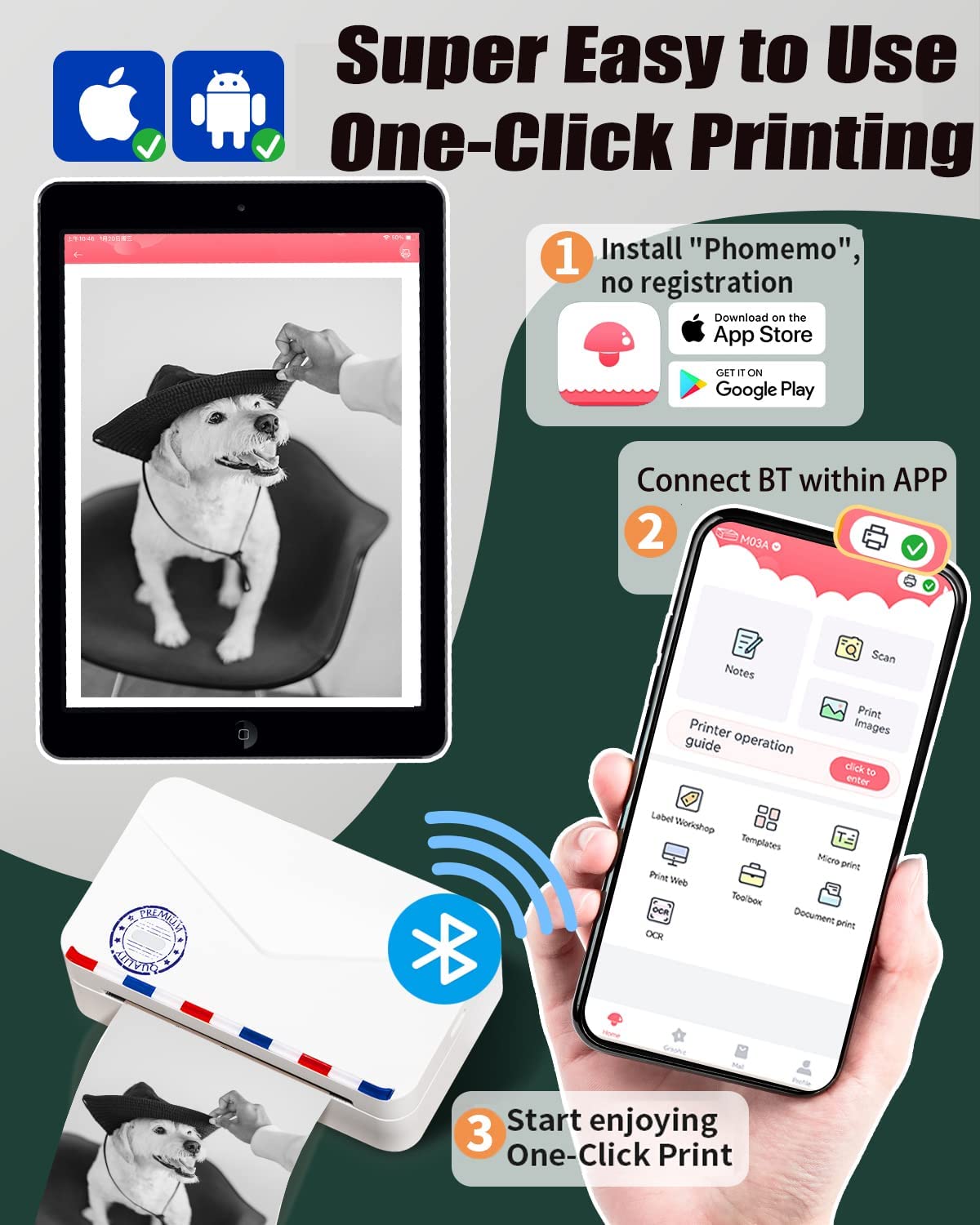 - Super Easy to Use: Step 1: Install the APP. Step 2: Connect the thermal photo printer Bluetooth within APP. Step 3: Choose a quick template and start enjoying one-click printing. Even a child can easily complete the first label in 5 minutes. APP can be used without registration, very friendly to new users.